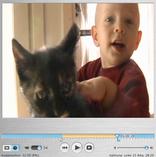 Valinta esitysikkunan avulla on tullut hieman epävarmemmaksi, mutta samalla valintamerkit ovat selkeämmät. FCP:hen verrattuna valintatyökalut ovat alkeelliset, mutta valtava on hintaerokin. Kun leikkaustapoja on tarjolla niin monia, kerron vain omista kokemuksistani. Ota tai kokeile omasi. Katselen leikkeitä esitysikkunassa käynnistämällä ja pysäyttelemällä niitä välilyöntinäppäimellä. Kun sopiva aloituspaikka sekä kuvassa että äänessä on kohdalla, pysäytän videon, pidän Shiftin pohjassa ja näpäytän hiirellä kolmiomerkkiä, joka ilmaisee videon etenemisen. Näin aloitusmerkki (viivan alla oleva kolmio) siirtyy pysäytyskohtaan. Nyt pitää lopetusmerkki vetää ohi äskeisen kohdan, jos sitä säätää seuraavaksi. Tällöin syntyy keltaista palkkia valinnan merkiksi. Käynnistän taas videon ja pysäytän sen sopivaan loppukohtaan välilyönnillä. Taas näpäyttämällä etenemistä ilmaisevaa kolmiota loppumerkki siirtyy siihen. Sitten vain kopioidaan pätkä (Omppu-C), mennään aikajanalle ja valitaan sopiva leikkauspaikka, mihin se siirretään. Voit myös poistaa valitsematta jääneet osat (sinisen palkin alueet), jos olet varma, ettet niitä enää tarvitse. Silloin valinta on Omppo-K. Käyttöpätkän voi kopioida ja liimata (Omppo-C ja aikajanalla Omppo-V) Kaikkia valittuja kohtia voi tarkentaa nuolinäppäimillä jos vaikka sähelsit hiirellä merkin sivuun. Oikeastaan homma käy hiukan helpommin valitsemalla loppu ensin. Se on monesti muutenkin luonnollisempi tapa. Silloin "kursorikolmio" siirretään ensimmäisen valinnan jälkeen alkuun ja haetaan vasta sitten alkupaikka. Nyt merkkejä ei tarvitse siirrellä toistensa ohi.