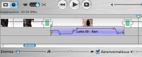 Kirjoitin iMovie2:n aikoihin jutun vaihtoehtoisesta leikkaustavasta. Se pätee pääosin edelleen. Nyt tosin Applekin on asian keksinyt ja tämän tyylin leikkaustapa mainitaan virallisilla esittelysivuillakin. Leikata voi siis vetämällä leikkeitä leikepöydältä aikajanalle. Silloin leikepöytä tyhjenee samalla. Alt pohjassa raahaamalla kopio jää leikepöydälle myöhempää käyttöä varten. Leikkeet voi myös kaapata kameralta suoraan aikajanalle, jos muokattavaa on vähän. Tällöin leikkeitä siistitään valitsemalla ne aikajanalla ja poistamalla turhia osia. Kuvakkeita (ruutusymboli kellon sijaan) voi järjestellä hiirellä vetäen. Minua miellyttää enemmän tapa, jossa leikekokoelman kuvaa näpsäyttämällä se siirtyy esitysikkunaan, missä turhat osat poistetaan ja leike kopioidaan (Omppu-C) sekä sijoitetaan sitten aikajanalle (omppu-V). Sijoittamisen voi tehdä keskelle entisiä kuvia, myös vanhan äänen säilyttäen (Shift-Omppu-V), tai loppuun, jos muuta valintaa ei ole tehty. Pikakelausviiva, jossa on kolmio päässä määrää leikkauspaikan, paitsi milloin joku kuvista on valittu, sinisenä. Silloin leikkaus menee sen perään.