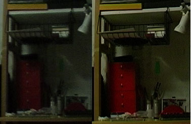 Mutta pärjääkö sillä pimeässä? | XM2 asettaa aloittamamme DV-kameroiden herkkyysmitaukset uuteen valoon tai aiheuttaa niiden täydentämistarpeen. Ammattikameroiden mittaus perustuu siihen, että kuvanparannuspiirejä ei mittauksessa käytetä, ne kytketään pois. Amatööripuolella se ei aina ole mahdollista. Nyt vertaillessani vanhaa DX100:aa ja tätä uutuutta, törmäsin ilmiöön, että herkkyys ei enää menekään lineaarisesti, vaan ilmeisesti jonkin käyrän mukaisesti. Joko kennot ovat muuttuneet ratkaisevasti tai Canon on kätkenyt kameraansa kuvanparannuspiirejä, joista ei kerrota, ja jotka eivät ole suoranaisesti signaalin vahvistus eli Gain-säätöjä. Kävi nimittäin näin: Aikaisemmissa mittauksissa Panasonic sai arvon 6.8, Canon XM1 6.2 ja nyt tämä megapikseliuutuus lähes saman, 5.6+. Ero saattaa johtua mittavirheistä. Huomiotani kiinnitti kuitenkin se, että Canonin kuva näytti kirkkaammalta hämärässä. Tein lisämittauksia. Tuo virallinen testi tehdään 2000 luksin valossa. Vähensin valon ensin 100 luksiin ja lopulta 50 luksiin, jossa jo tarvittiin vahvistuksia. Canon ohitti herkkyydessä Panasonicin, sitä enemmän, mitä hämärämpää oli. Kun Canon XM2 kirkkaassa valossa oli 1/2 aukkoa epäherkempi, hämärässä se olikin 3/4 aukkoa herkempi ja lisäksi kuva oli selvästi terävämpää ja värit voimakkaammat. Panasonicin kuva myös sisälsi kohinaa, "lumisadetta" huomattavasti enemmän kuin uutuuskamera. Parannusta on tapahtunut, ja sehän on hyvä asia. Menee vain tuo testimenettely uusiksi, jos muutkin tekevät tällaisia kätkettyjä ominaisuuksia. Tyypillinen ero kuvissa, kun valoa huoneen peränurkassa on vain 20 luksia. Vahvistuksia kameroissa oli +12 dB. Vanha vasemmalla, uusi oikealla. Kaikki testikuvat ovat osia videosta 1:1 koossa, terävöittämättä ja muutenkin muuttamatta. Tämä rajaus on keskeltä kuvaa.