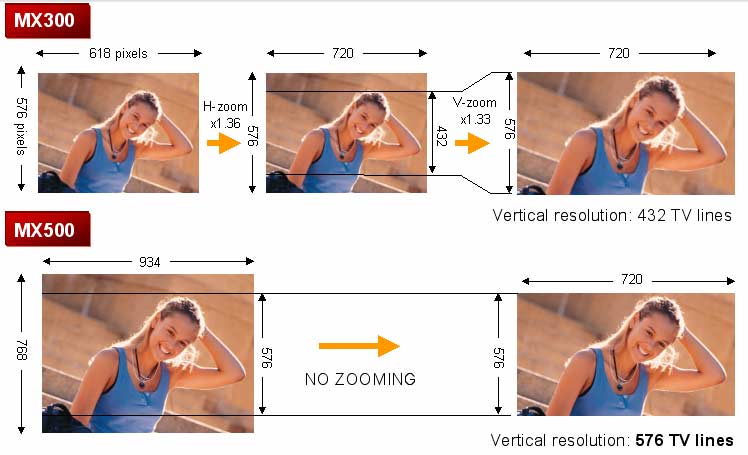 Parasta kameraa ei vieläkään ole markkinoilla. Syksyn mittaan on kaikenlaisia uutuuksia putkahdellut kameratehtaiden liukuhihnoilta tai ainakin suunnittelupöydiltä. Eri tehtaat ovat lähteneet hieman eri suuntiin etsimään viisasten kiveä. Tulevaisuus vasta näyttää, kuka arvasi parhaiten kuluttajien tarpeet ja kehityksen suuntalinjat. Sony toi ensimmäisenä (ehkä joitakin viikkoja ennen Panasonicia) markkinoille aidolla laajakuvakennolla varustetun pikkukameran, tosin DVCam-formaatissa. DSR-PDX10P on tutumman TRV950-mallin muunnos, jossa nauhoitusformaatin muutoksen lisäksi on kennon käyttöä laajennettu. Kun TRV950 käytti koko alaa vain stillikuviin, PDX10 ottaa laajakuvamuodossa kennosta enemmän pinta-alaa käyttöön ja laajentaa samalla kuvakulmaa, mikä olikin TRV950:n heikkouksia. Tähän astiset raportit muunnoksesta ovat olleet ristiriitaisia, mutta kyllä sen laajakuva pitäisi olla pystysuunnassa tarkempaa kuin aikaisempien mallien. Panasonicin vastaus tuli välittömästi, vaikka valmistaja ei näytä korostavan 16:9 kennoaan millään tavalla. Sitä ei aina edes mainita ominaisuuksien luettelossa. Löysin kuitenkin Taiwanilaiselta sivulta kuvallisen selityksen, mitä kehitys on tuonut uutta siirryttäessä MX300 mallista tähän laajakuvaiseen MX500-malliin. Sonyn kehitys oli hieman erilainen. Heillä oli isompi kenno jo edellisessä mallissa, mutta sitä käytettiin vain stillikuviin. Videolle otettiin keskeltä pienempi alue. Uudessa mallissa käytetään koko kennon leveys myös videolle. Sonyn kennolla pitäisi olla hieman enemmän pikseleitä, mutta eipä näistä tiedä varmuudella kun toiset ilmoittavat brutto, toiset nettomääriä eivätkä aina kerro, kummasta on kyse. Todelliset, käyttöön tulevat pikselit ratkaisevat. Monet tehtaat ilmoittavat nämä sanalla effective. Sitä paitsi pikselien lukumäärä ei kuvan laatua ratkaise. Hyvissä ammattikameroissa on 3kpl 4-500.000 pikselin kennoja. MX300:n perinteinen tapa tehdä 1.78-laajakuvaa (eli 16:9) on ylhäällä. Kennon koko ei riitä kumpaankaan suuntaan, vaan ennen nauhalle vientiä kuvaa suurennetaan vaakasuunnassa, rajataan laajakuvaksi ja taas suurennetaan pystysuuntaan. Sanovat sitä zoomaukseksi. MX500:n kenno on lähes laajakuvan levyinen (oikeasti laajakuva on 1024x576, kun neliönmuotoisista pikseleistä puhutaan). Tästä vain valitaan sopiva rajaus ja muuttelematta viedään nauhalle. Tuo kuulostaa paremmalta ja ilmeisesti onkin sitä. Hämmennystä saattaa aiheuttaa se, että lopputulos on 720x576 pikseliä. Sehän on aivan sama kuin perinteisen 1.33-kuvasuhteisen koko. Niin asian pitääkin olla nauhalla. Vasta katselussa laajakuva levitetään lopulliseen kokoonsa. Pikselit ovat joustavia, niiden leveyttä voi muutella katselussa nauhalla olevan tunnistusbitin mukaan. Uudessa MX500-mallissa väitetään olevan stillikuvissa 3 miljoonaa pikseliä. Vaikka tuon koko kennon käyttäisi kolmeen kertaan ei sittenkään päästä noihin lukemiin. Selitys on, kuten Canonillakin Pixel-shift. Vihreä kenno on puoli pikseliä sivussa ja siitä saadaan kuulemma etua terävyyttä laskettaessa. Kamerassa on pikkuruiset 1/6" kennot. Hyvästi terävyysalue. Panasonicin varsinainen uusi avaus on 24P-kamera, filmitaajuutta kuvaava progressiivinen kuvantekijä. Siitä tulee varmasti ainakin NTSC-maissa haluttu kamera - ja myös haukuttu, sillä laadukasta kuvaustyyliä osaamaton saa tällä kauhean näköistä jälkeä aikaiseksi. Hidas kuvataajuus ei sovi nopeisiin liikkeisiin. Meillä PAL-alueella on ennenkin kuvattu 25 kuvaa sekunnissa, joten tuossa ei niin paljon uutuutta ole. Sen sijaan uutta pienissä kameroissa on sen progressiivinen kuvaustapa. Tässä muodossa ei erään nettiesittelyn mukaan ole lainkaan sähköisiä vahvistuksia ja syitä selittäessään esittelijä paljasti todellisen uutuuden: Kamerassa on filmigamma, sävyasteikkoa on muutettu siten, että valkoiset eivät heti pala puhki ja mustat sävyt jatkuvat loivemmin kuin lomitettussa kuvassa. Vahvistukset olisivat kuulemma sekoittaneet tämän säädön ja siksi ne jätettiin pois. Hyvä niin. Parempi valaista hämärät kohteet kuin vahvistaa signaalia. Kameran herkkyys on tehtaan ilmoituksen mukaan ammattikameroiden tasoa, paras pikkukameroista. Tässä on kolmannestuuman kennot, 3x410.000 pikseliä, eikä mitään stillikuvia. Tällä tehdään elokuvaa. Ammattilaiskameroissa on kyllä jo vuosia ollut sekä säädettävä gamma, knee-säätö valkoisten ja black stretch mustien laajentamista varten sekä käyttäjällä mahdollisuus säätää vahvistuksia. Panasonic on johtavia ammattikameroiden valmistajia, joten taatusti se olisi osannut nuo ominaisuudet yhdistää. Kysymys kuuluu, eikö haluttu vai ehditty? Panasonicilla oli jo vuosia sitten Japanissa eräässä miniDV-kamerassaan Skin Detail, mahdollisuus pehmentää ihon värisiä kohteita eli poistaa ryppyjä. Mallin PAL-versiosta ominaisuus puuttui. Sitä toivoisin ainakin malliston huippupäähän myös pikkukameroihin. Säädettävä tai valinnainen gamma olisi kyllä toivomuslistallani vieläkin korkeammalla. JVC taas tuo ensi vuonna HD (High Definition = teräväpiirto)-kameran. Eurooppalainen HD on lepovaiheessa, joten sille ei voi odottaa isoja markkinoita, mutta Amerikassa noita ehkä tarvitaan. Tosin jotkut TV-yhtiöt täälläkin näyttävät siirtyvän HD-tuotantoon korvatakseen sillä 35mm filmiä, joten ehkä sittenkin jotakin kysyntää voi odottaa. Se vaatii taas aivan uudenlaiset editointi- ja siirtovälineet, joten antaa ajan kulua. Katsotaan mitä tulevaisuus tuo tullessaan.