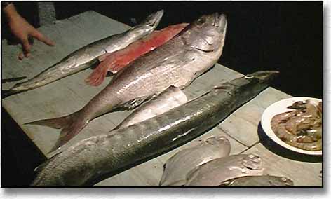 Rantalomakohteissa saa erinomaista kalaruokaa. Olen kuullut kerrottavan, että hindulaisuus kieltää kalaruoan (lihan lisäksi), mutta rannikkopaikkakunnilla kala on sallittua. Uskonto on ilmeisesti hyvin käytännönläheinen ohjeisto ajalta ennen pakastustaitoa. Sillä varjeltiin kansalaisia pilaantuneelta ruoalta. Rantapaikoissa voi kuitenkin itse seurata, miten tuoreketju toimii. Kalastajat saapuvat saaliineen suoraan turistien sekaan hiekkarannalle. Saaliin suurimmat kalat kerätään koreihin ja kannetaan pään päällä rantaravintoloihin. Siellä ne asetetaan esille ravintolan eteen pöydälle, josta asiakkaat valikoivat syötävänsä. Parhaassa tapauksessa kala on vielä tuntia aiemmin uinut vieressä aaltoilevassa meressä. Hieman jäi askarruttamaan, mitä tapahtuu pöytiin jäävälle kalalle, mutta varmaan sillekin käyttö löytyy, sillä seuraavana päivänä saadaan taas uutta saalista. Joissakin ravintoloissa on kylmäsäilytystiloja ja jäitä käytetään. Kala-aterian hinta on usein siinä kympin paikkeilla suomen rahassa, mutta erikoisuuksista saa maksaa lisää. Turistirannoilla on selvästi kalliimpaa kuin kaupungeissa, mutta valikoimakin on runsaampi. Barracuda tässä kuvan keskellä ei minulta saa kovin korkeita pisteitä. Se muistuttaa paitsi näöltään, myös ruotoisuudeltaan meidän haukeamme. Litteät "snapperit" (kuvan alalaidassa), joita myydään monella eri nimellä ovat oivallista raaka-ainetta hyvälle kokille. Tonnikalaa saa myös tuoreena, mutta hai, Baby Shark on oivallista pihviainesta. Ne ovat metrin- puolitoista pitkiä ja parhaat palat leikataan keskeltä. Fish tikka, puhtaaksi perattu kala on suosittua, vaikka monissa lajeissa ei juuri ruotoja ole kuin selkäranka. Tikka muuten tarkoittaa muissakin yhteyksissä puhtaaksi perattua, esimerkiksi luuton kananpoika on Chicken tikka. ........ Jumbo-, tiger- yms. prawns, eli valtavankokoiset katkaravut ovat erityisherkkuja, jotka eivät kuitenkaan maksa maltaita. Itse asiassa mallasjuomat ovat aterian hinnakkain osa monessa paikassa verotuksellisista syistä. Hummeriateriaan voi myös tutustua rantalomakohteissa. Hinnat olivat -99 kolmensadan rupian luokkaa (fim 40:-) ja sillä sai esim. puoli kiloa saksiniekkoja ja ne sai myös perattuna joissakin paikoissa. Kuoret olivat tietysti koristeina mukana. Oma suosikkini on mustekala, "calamari", kun se oikein maustetaan. ......mmmmmmm, aaaah !! |